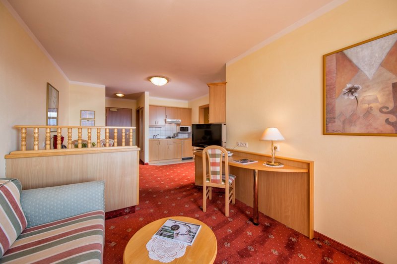 - Soggiorno con angolo cottura completo di: piastra elettrica, macchina da caffé, bollitore d'acqua, lavastoviglie, frigorifero, forno a microonde, stoviglie e utensili da cucina, posate, TV satellitare conricevitore digitale e radio, telefono con selezione diretta;